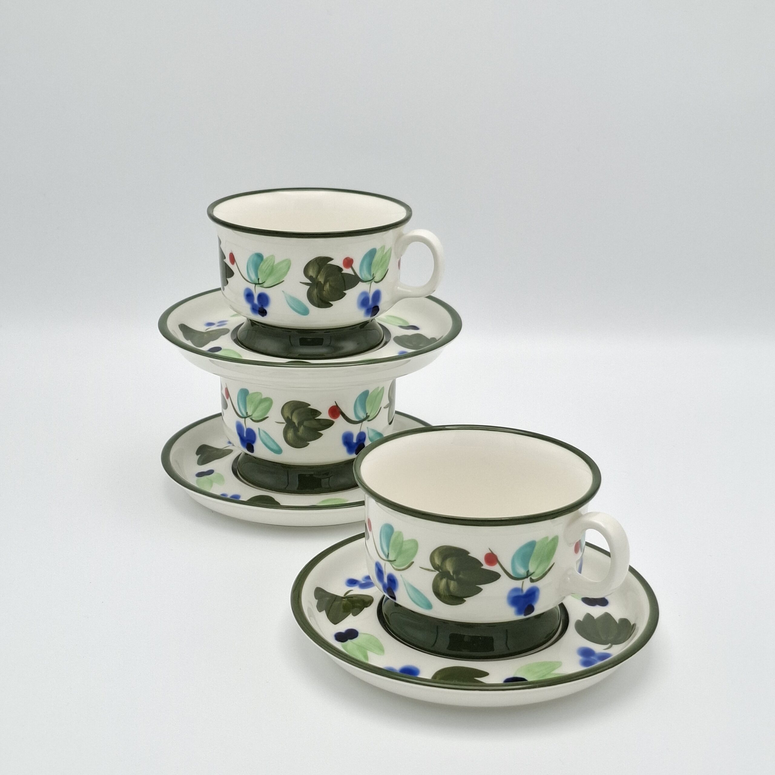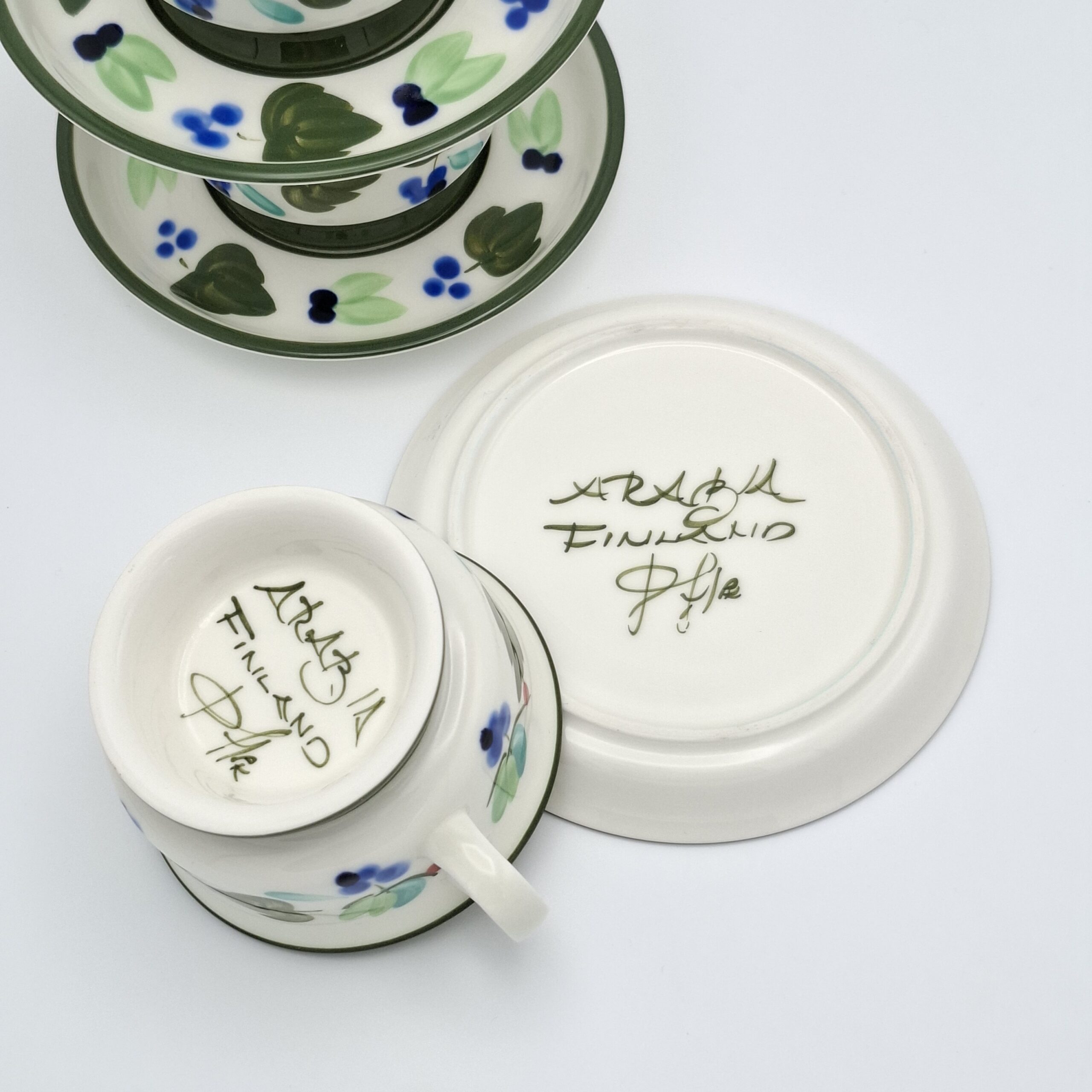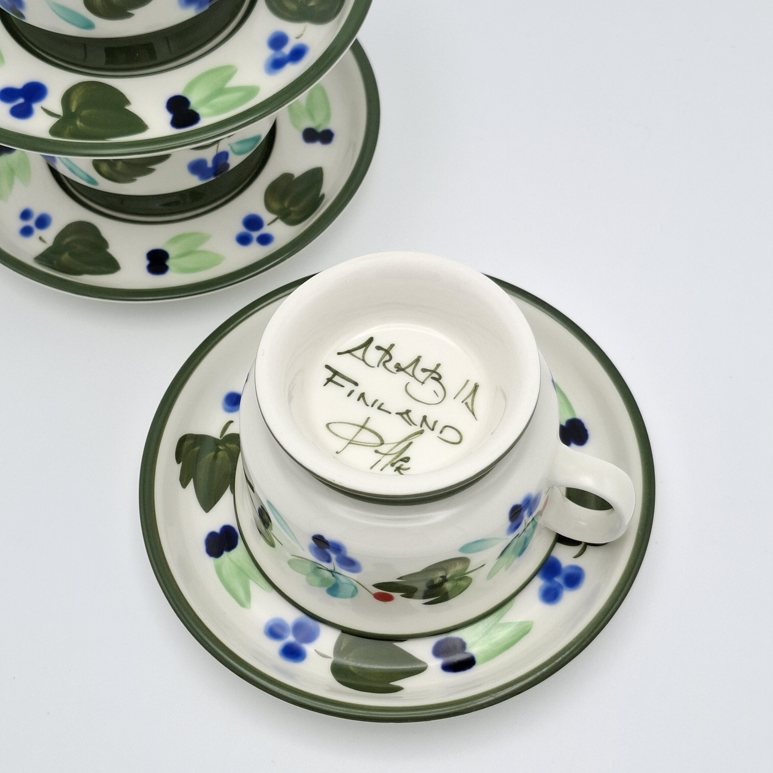 Dorrit von Fieandtin suunnittelemat Palermo-sarjan käsinmaalatut teekupit asetteineen. Valmistaja Arabia, tuotannossa vuosina 1987-1993. Myydään kolmen kupin ja aluslautasen settinä, hinta on yhteishinta kaikille.
