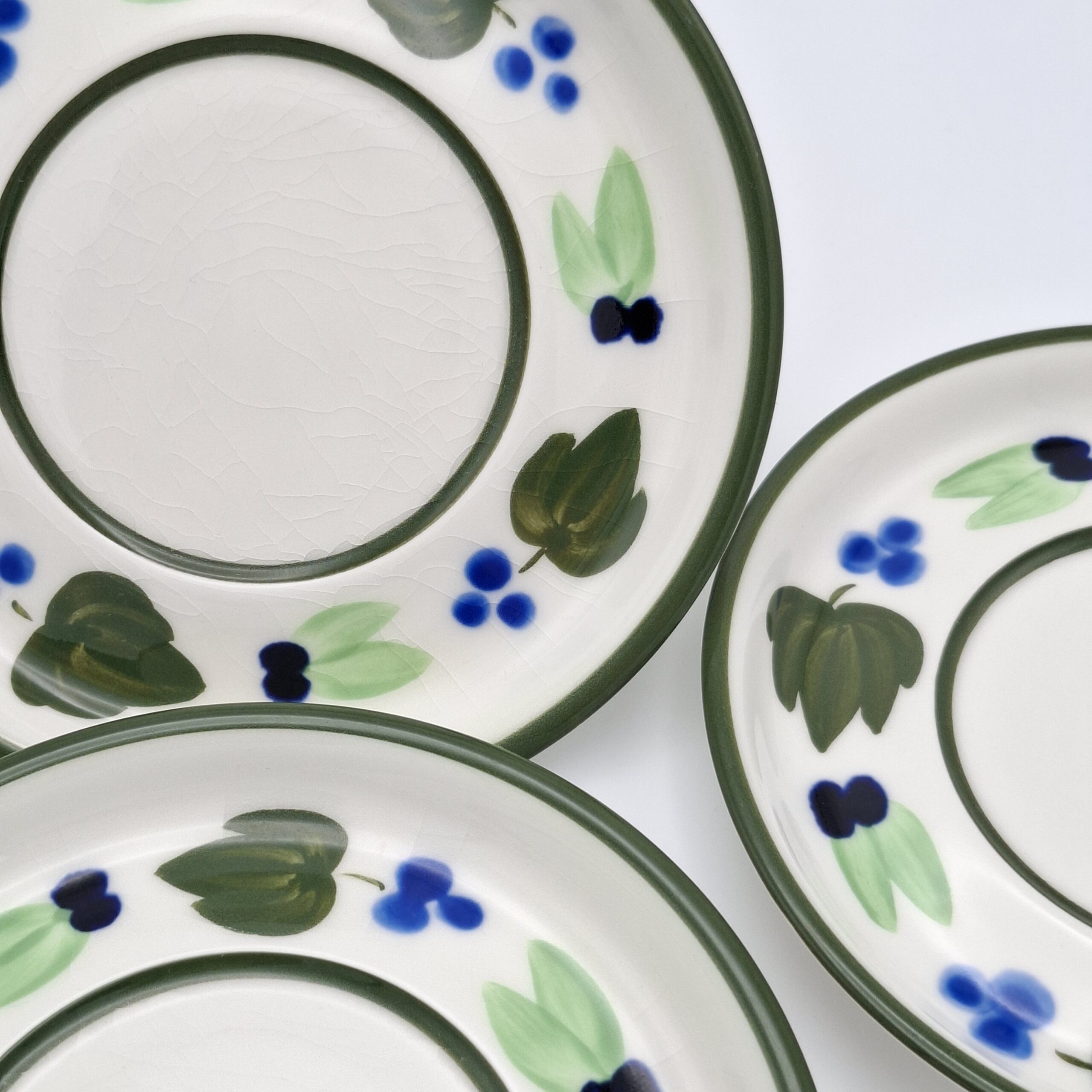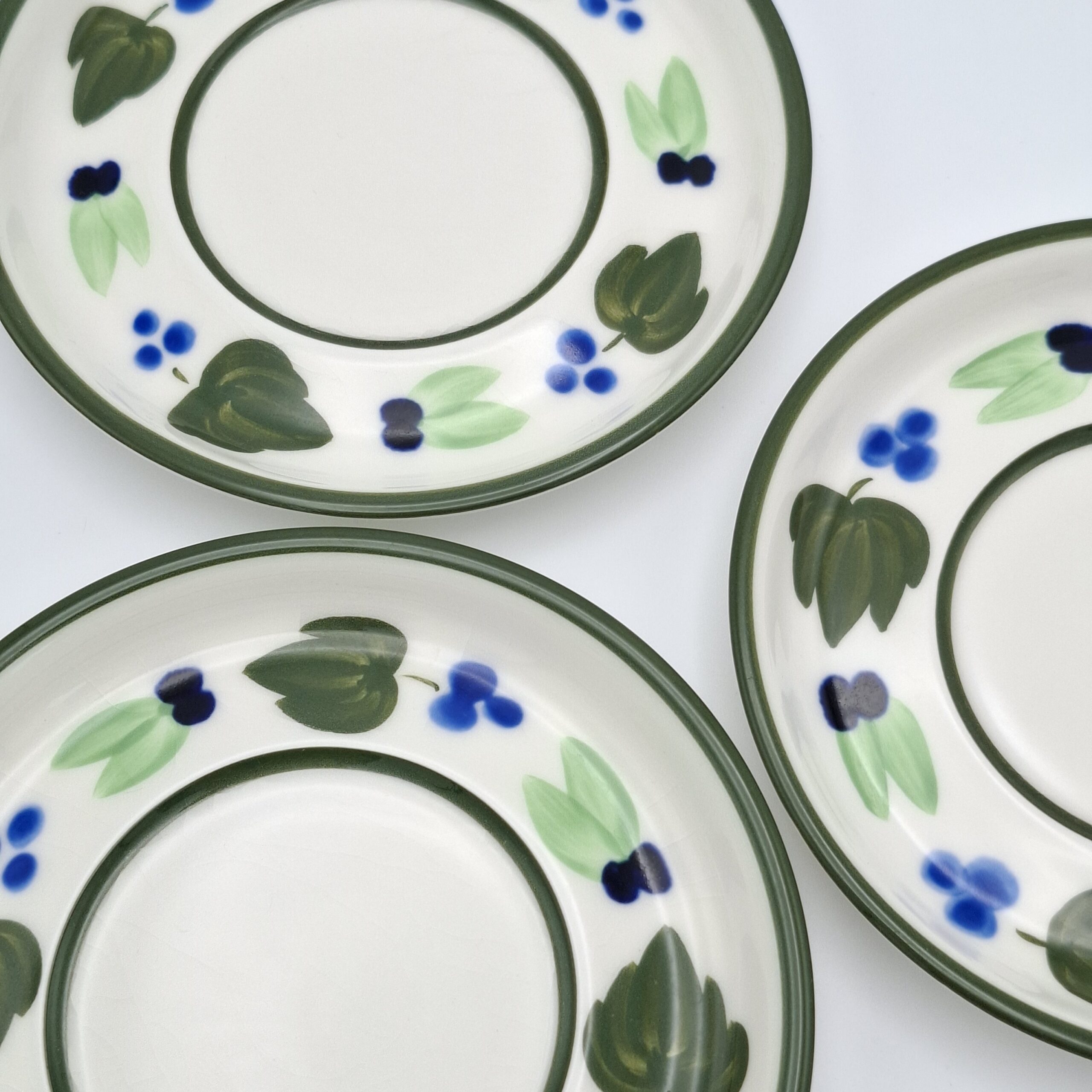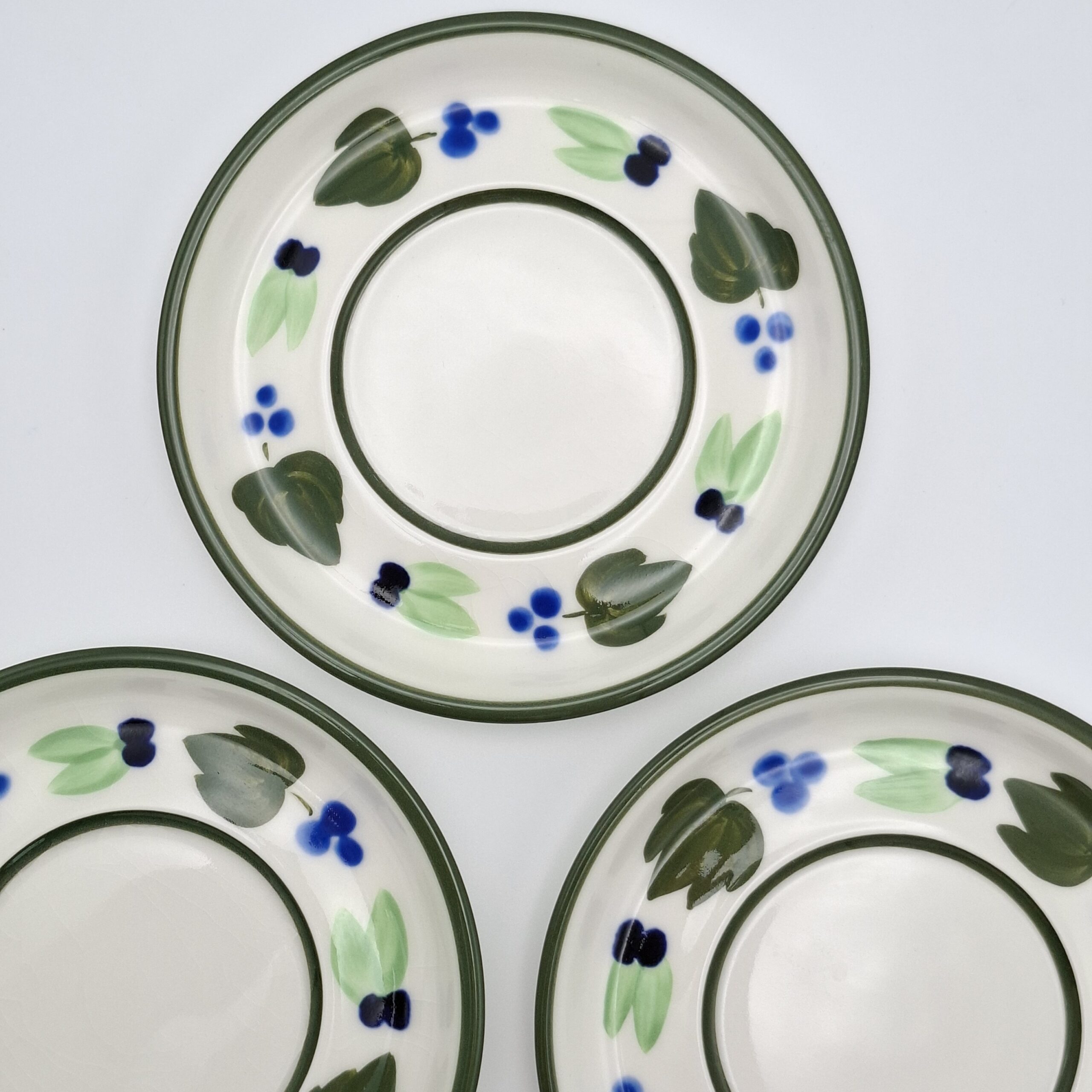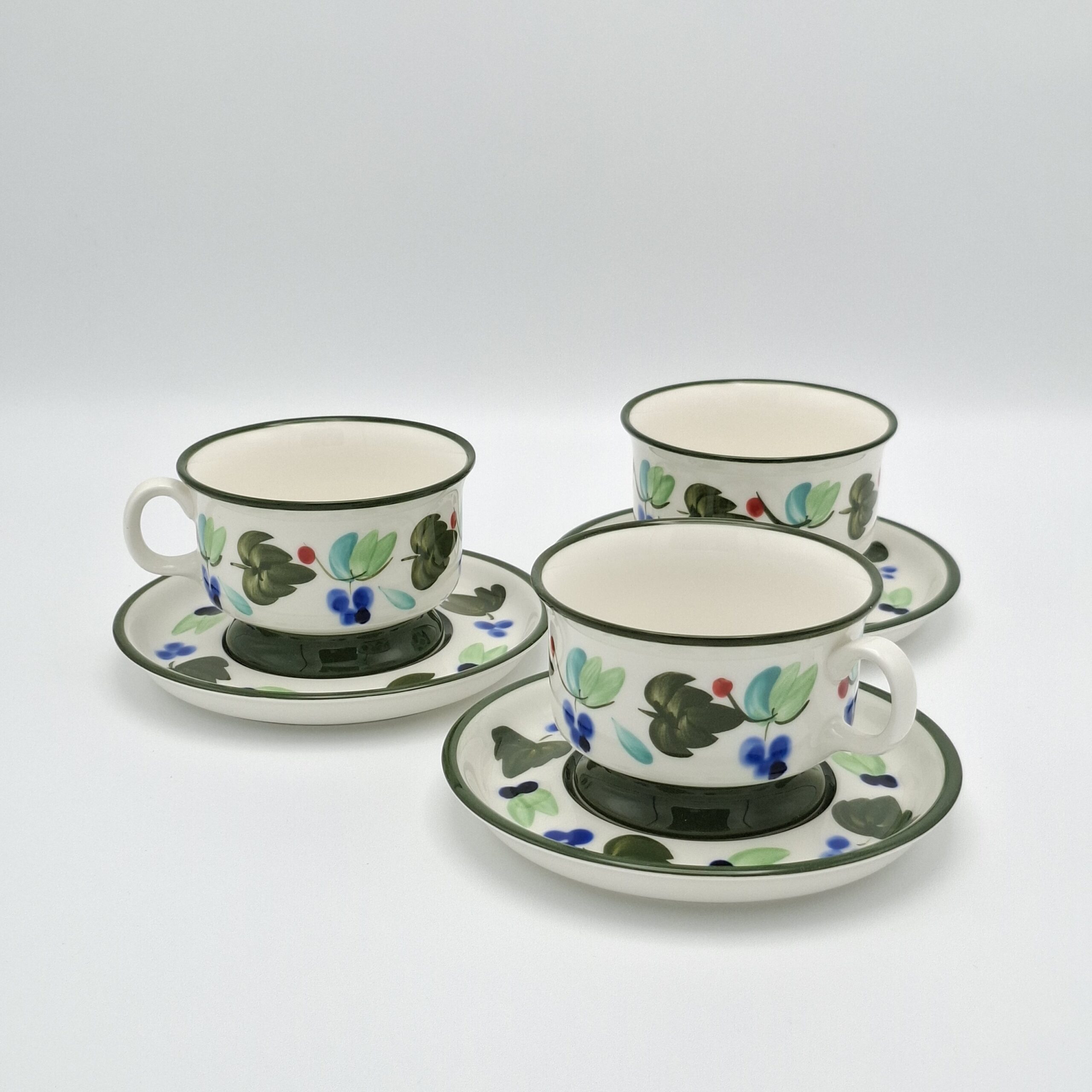 Dorrit von Fieandtin suunnittelemat Palermo-sarjan käsinmaalatut teekupit asetteineen. Valmistaja Arabia, tuotannossa vuosina 1987-1993. Myydään kolmen kupin ja aluslautasen settinä, hinta on yhteishinta kaikille.