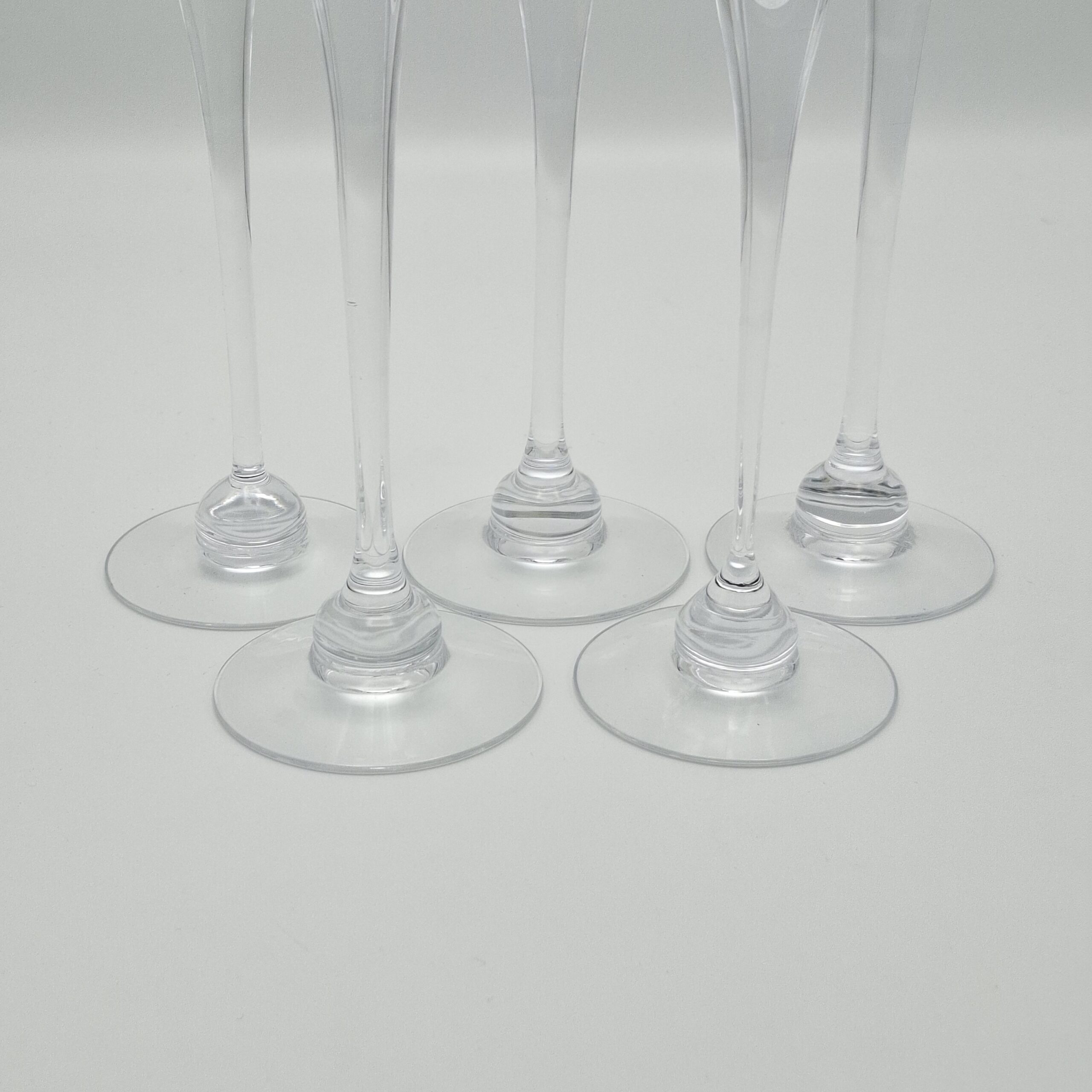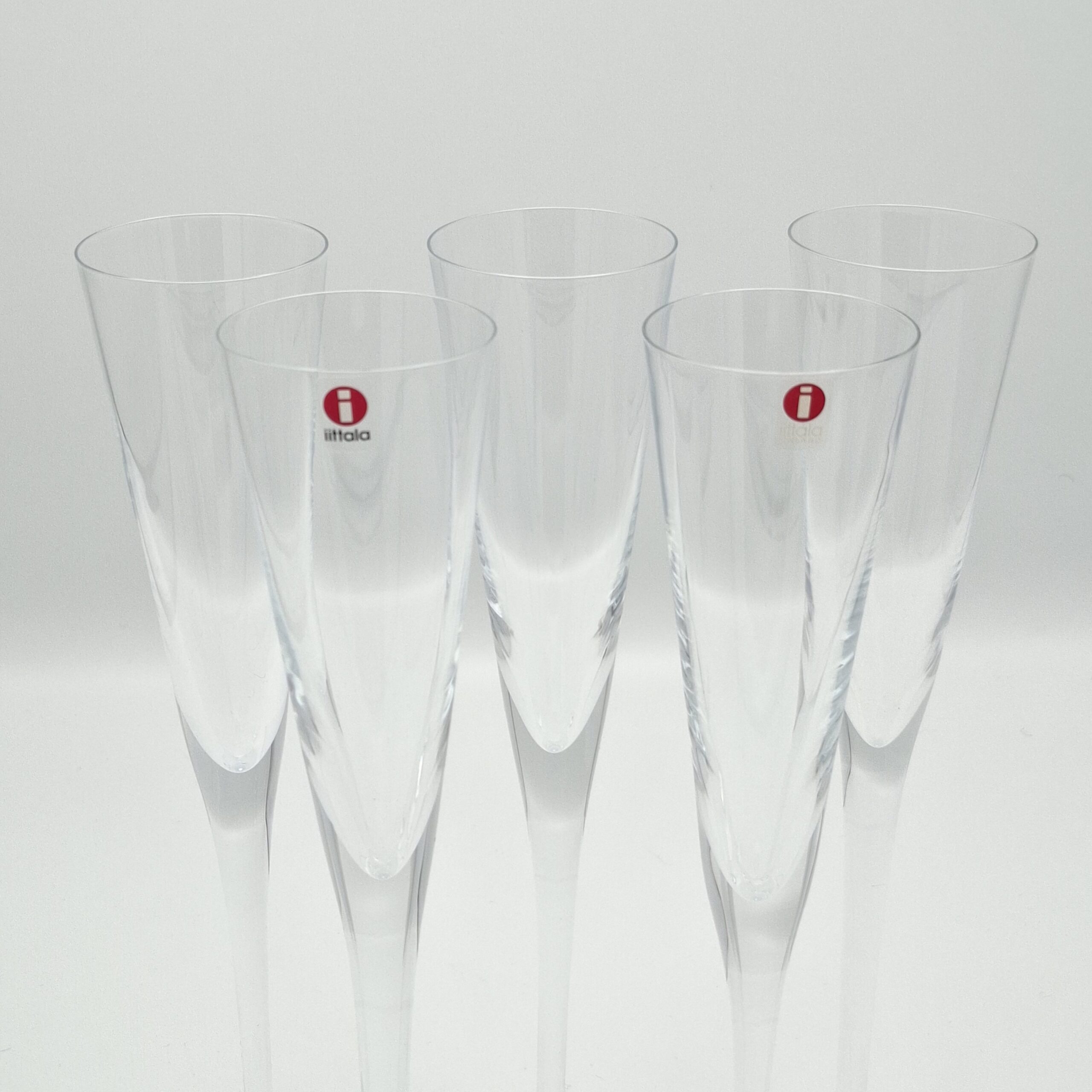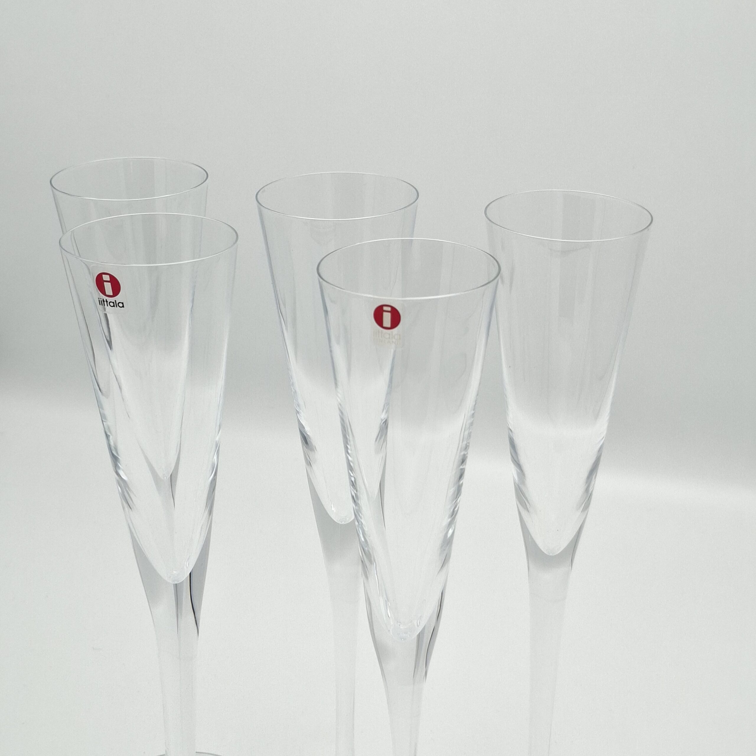 Heikki Orvolan suunnittelemat Aurora-sarjan kuohuviinilasit / samppanjalasit. Valmistaja Nuutajärven lasi. Korkeus 26,5 cm.